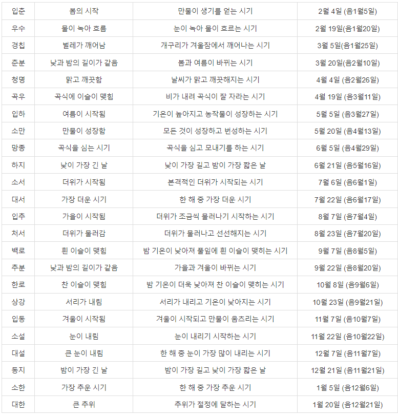 이는 곧 계절의 변화를 나타내며, 농사 시기를 비롯한 모든 생활에 큰 영향을 미쳤습니다. 중국에서 시작되어 한국, 일본 등 동아시아 지역을 전파되어 사용되었습니다